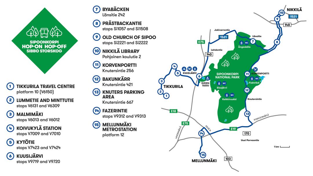 The Sipoonkorpi Hop-On Hop-Off bus route runs from Tikkurila through Koivukylä station and Kuusijärvi to Sipoo's Nikkilä. From Nikkilä, the bus travels via Sipoo's Old Church, Sipoonjoki Heritage Sauna, Korvenportti and Fazerila to Mellunmäki metro station. There are a total of 15 stops on the route.
